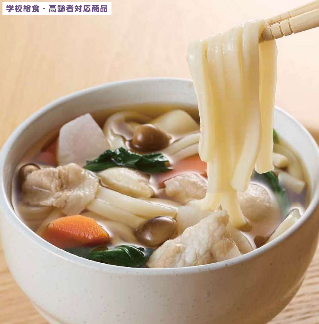 以九州產小麥「チクゴイズミ」為主要原料製作的烏龍麵,麵條長度約15公分,方便孩童食用與夾取。